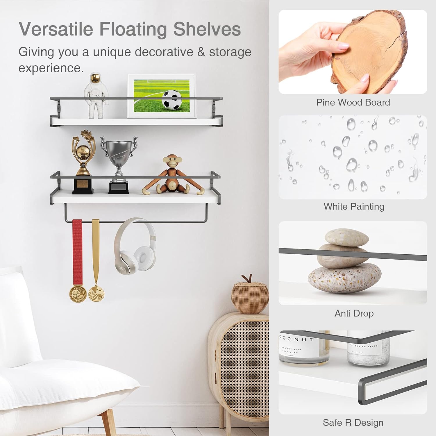 Forbena White Floating Shelves for Bathroom Organizer Over Toilet, Bathroom Shelves Wall Mounted with Towel Rack, Corner Wall Shelf for Bedroom Decor Kitchen Storage (White-Dark Grey, Set of 2)